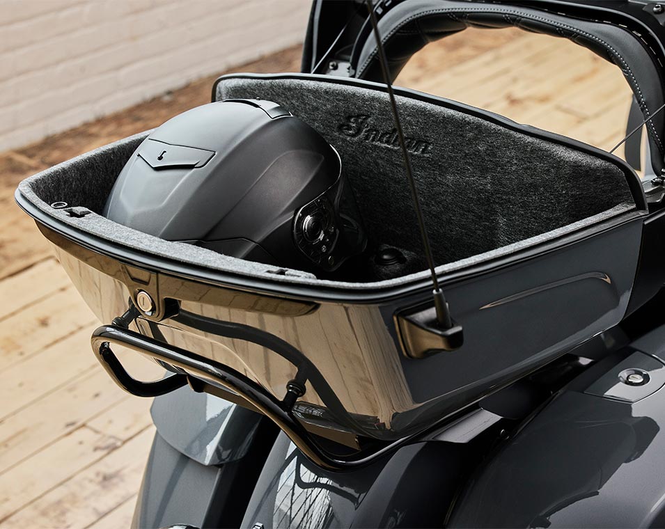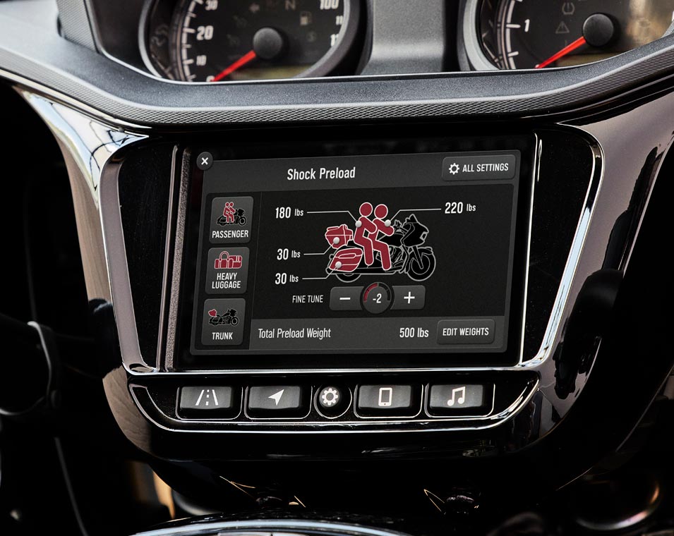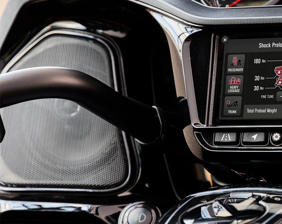 | Standard Equipment | Smart Lean Technology; Electronically Adjustable Rear Suspension Preload; Heated Seat; Integrated Driving Lights in Lower Fairing; Lower Fairing Storage; 7" touchscreen powered by Ride Command with Apple CarPlay integration; Selectable Ride Modes; Rear Cylinder Deactivation; Cruise Control; Tyre Pressure Monitoring; Remote-locking Hard Saddlebags & Trunk; 164 Litres of Storage; Highway Bars; Adjustable Passenger Floorboards; Brembo brakes; ABS; Keyless Ignition; Chassis Mounted Fairing; Power Windshield; Adjustable Fairing Air Flow Vents; Heated Grips; 200 Watt Audio System with AM/FM, Bluetooth, USB, Smartphone Compatible Input; 12V Charging Port |