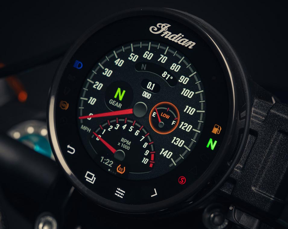 4 in Touchscreen powered by RIDE COMMAND. Touchscreen display includes real-time clock; ambient air temperature; heading; audio information display; map/navigation; Bluetooth status for phone and headset; vehicle status (voltage, engine hours, oil change); vehicle info (speed, fuel range, RPM, gear position); current ride data (distance, moving time, stop time, altitude, altitude change); trip meters; ride mode selection; screen brightness; and vehicle trouble code readout.